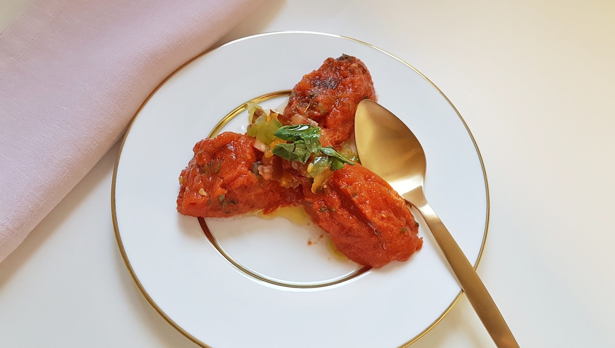 Librement inspirée d’une recette ancienne de Joël Robuchon, mais l’essentiel y est. Cuisson moins longue, crème fouettée remplacée par des blancs d’œufs en neige et j’ai accompagné d’un concassé de tomates multicolore et citronné. Ça vous va ? À préparer tranquillement la veille.