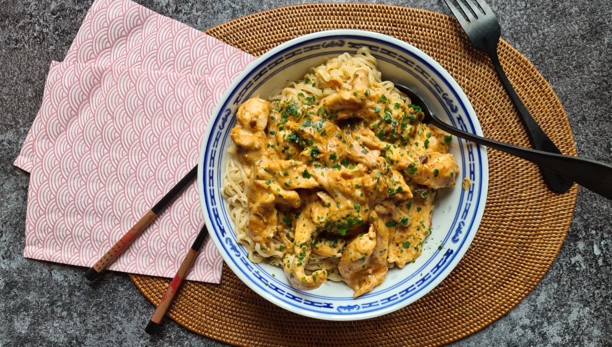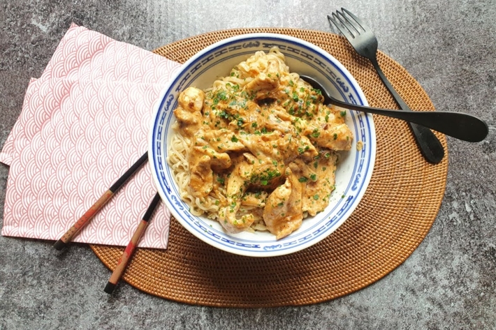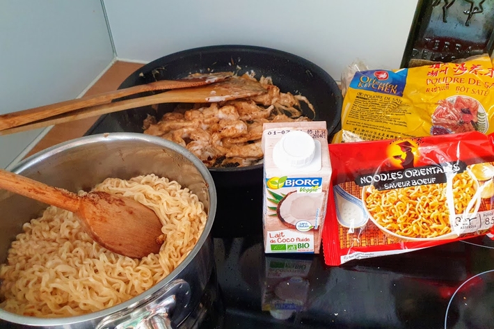 Des émincés de poulet avec les moyens du bord, pendant la crise sanitaire du Covid-19… Des pâtes asiatiques de la supérette voisine, des blancs de poulet et de la poudre de saté du placard. Si vous trouvez de la poudre de saté dans un supermarché asiatique, achetez-en, vous ne le regretterez pas !