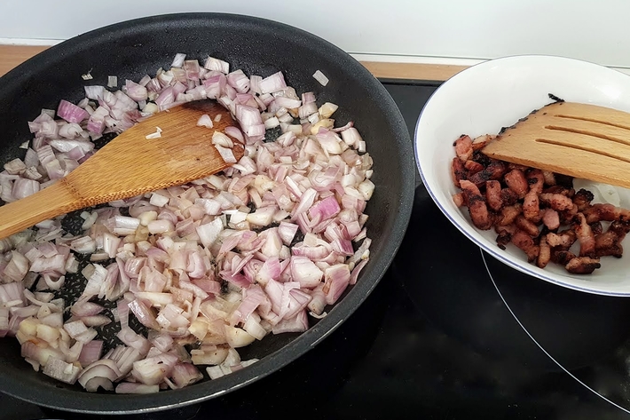 Faites suer les lardons dans une grande poêle à feu doux et couverts. Quand ils ont rendu leur graisse, découvrez et faites-les griller.