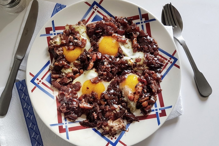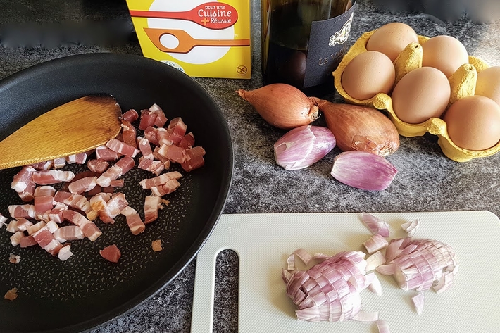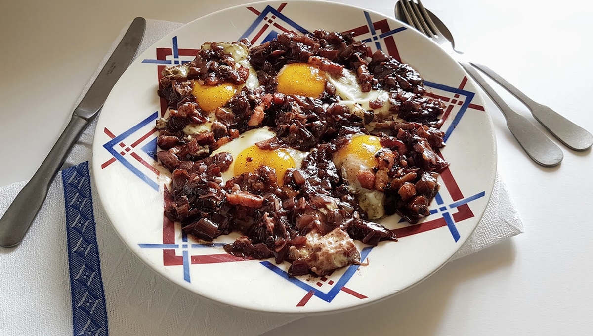 Je vous vois finement sourire… Les couilles d’âne sont des échalotes-oignons du Berry, tout simplement. Les œufs sont directement pochés dans la sauce aux échalotes et au vin rouge, contrairement aux œufs en meurette. Et les lardons grillés sont ajoutés à la fin, quand les blancs d’œufs sont pris. Régalez-vous !