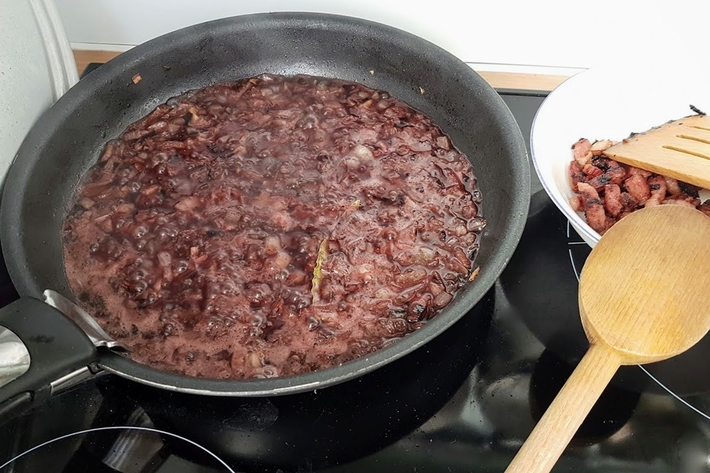 Mais si le fond de la poêle a beaucoup attaché, pas de panique, les échalotes et, surtout, la sauce au vin rouge, ensuite, dissolvent complètement les sucs.