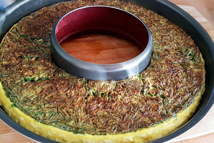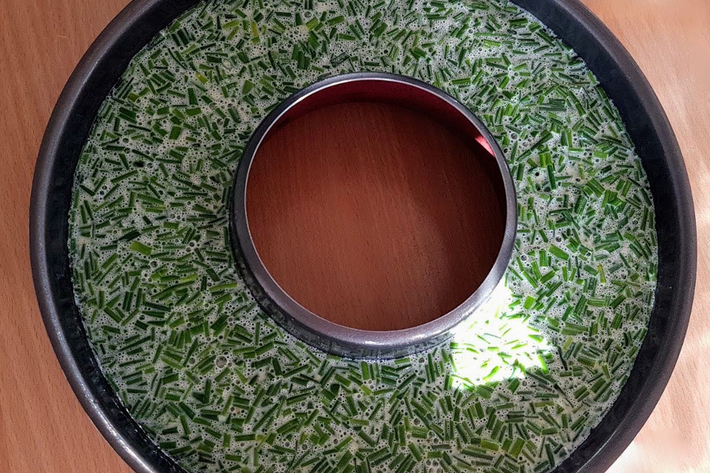 Après 10 à 15 minutes, comme la ciboulette sera remontée à la surface, ouvrez le four et mélangez la ciboulette avec une fourchette dans le moule et poursuivez la cuisson.