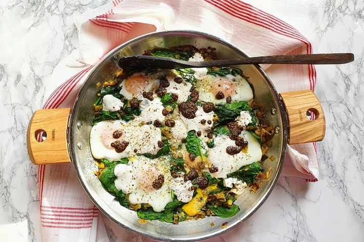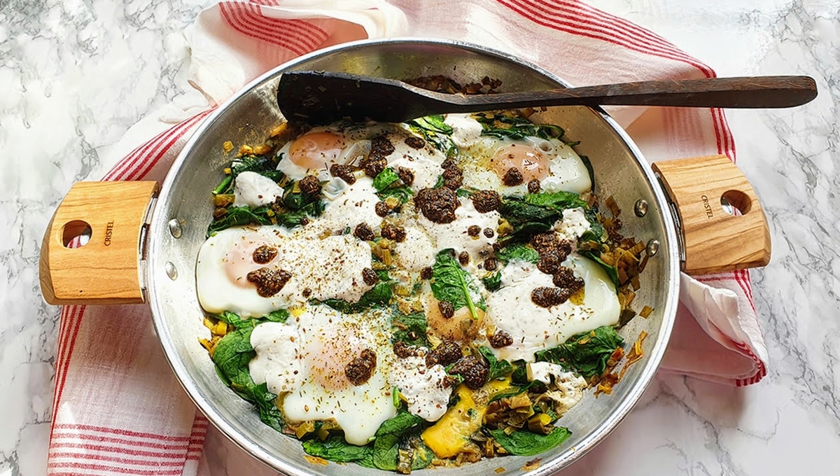 Voici un plat proposé par Yotam Ottolenghi, dans “Simple”, pour un brunch ou un dîner léger, accompagné d’une tranche de bon pain de campagne grillé et d’un verre de vin rouge.