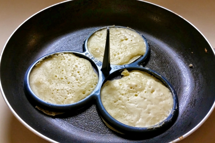 Notez que la pâte est épaisse, pas fluide comme la pâte à crêpes. Vous pouvez donc verser trois portions dans une grande poêle pour cuire trois pancakes à la fois, mais si vous avez un séparateur (vu chez Kitchen Bazaar), vous serez plus tranquille.