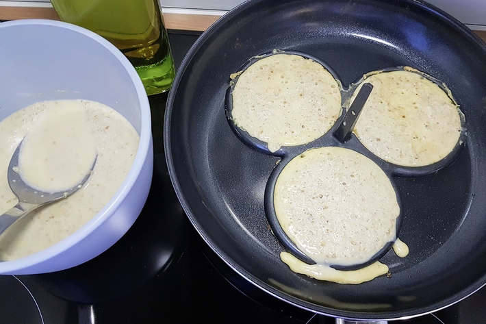 Dès que le pancake commence à prendre, retirez les cercles ou le séparateur et retournez-les.