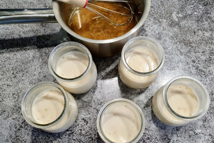 Répartissez dans des petites verrines et placez-les au réfrigérateur pour que la crème prenne (en hiver, elles refroidiront plus vite sur le rebord de votre fenêtre). Comptez environ 2 heures.
