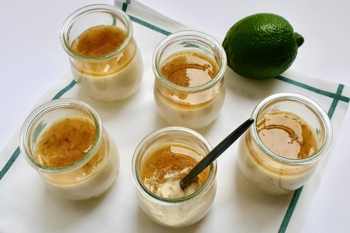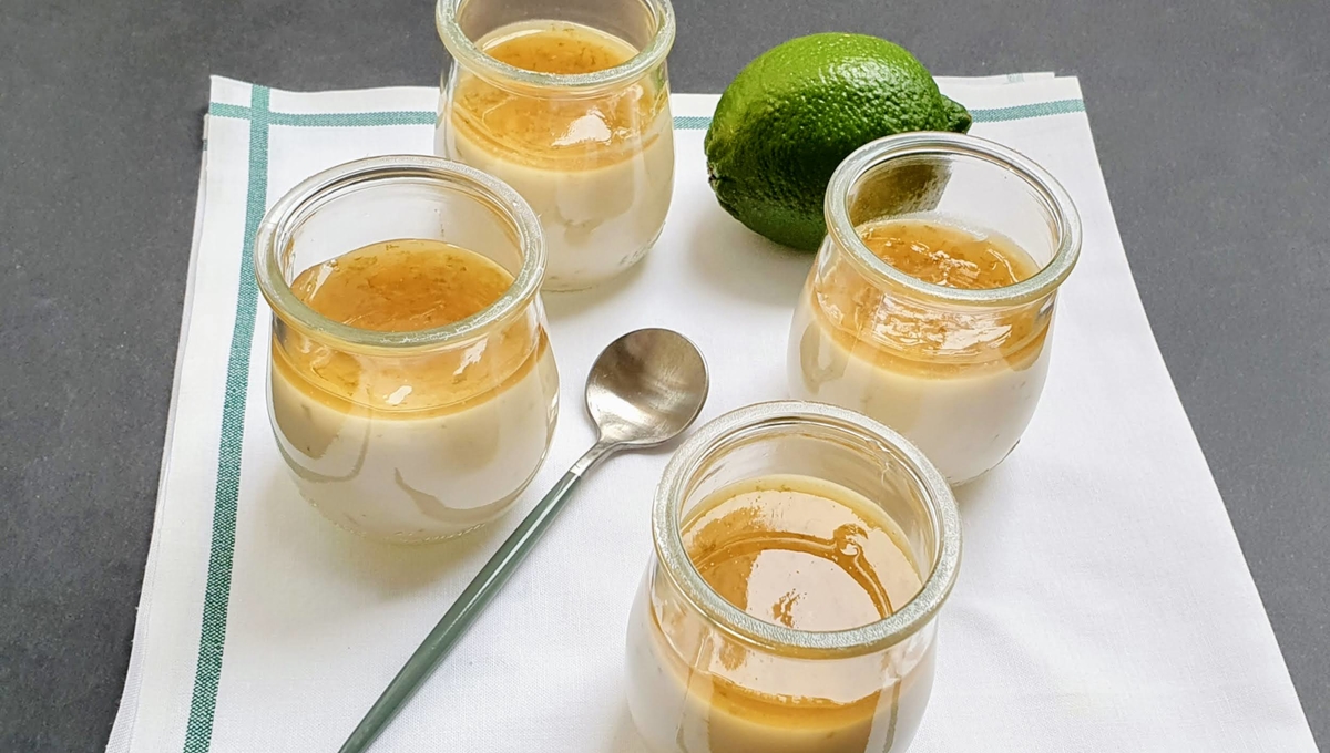 Panna cotta, c’est un bien grand mot pour parler d’une crème prise, voire d’un flan. Ce délicieux entremets exotique, très léger, plaira aux amateurs de citron vert. Les végétariens utiliseront de l’agar-agar pour remplacer la gélatine.