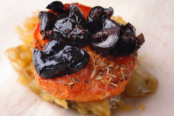 Répartissez au milieu de chacune d’elles une couche d’oignons, de tomates, des olives, des tomates, des oignons.