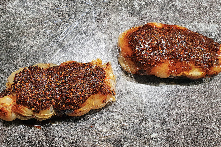 Ficelez-les deux par deux, face épicée l’une contre l’autre.
