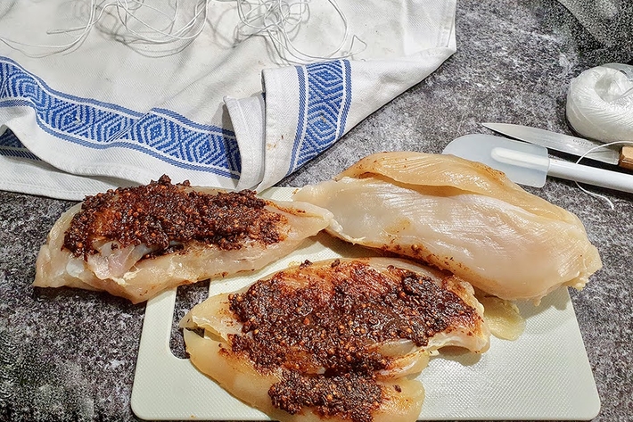 Badigeonnez bien une face des filets de poulet avec ce mélange.