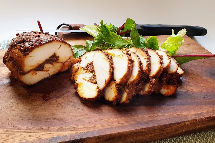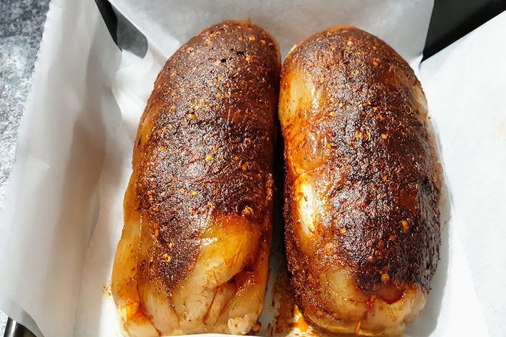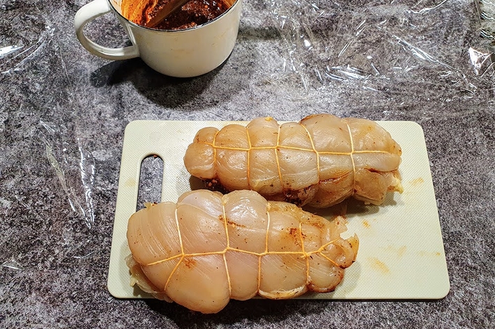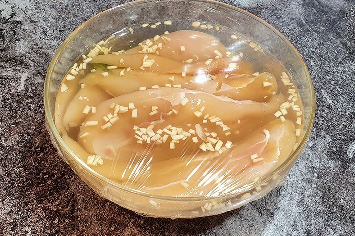 Enveloppez les filets de poulet dans du papier d’aluminium et laissez au moins 4 heures au frais.