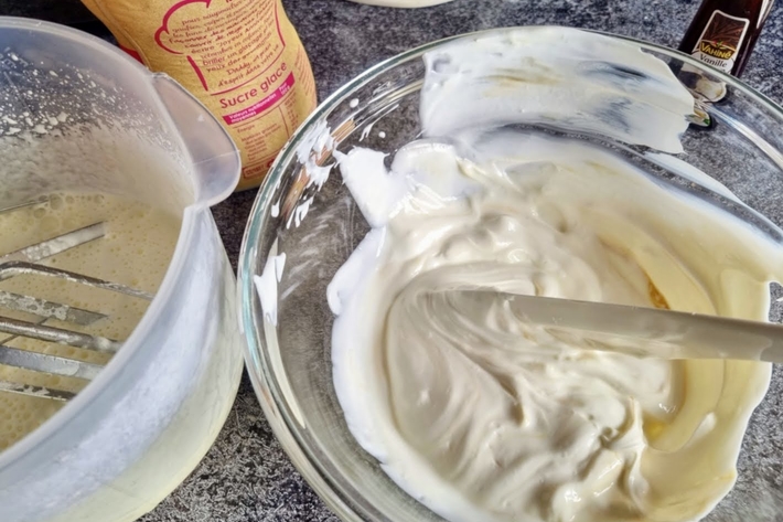 Fouettez la crème en incorporant le sucre glace jusqu’à ce qu’elle soit ferme, mais pas trop.