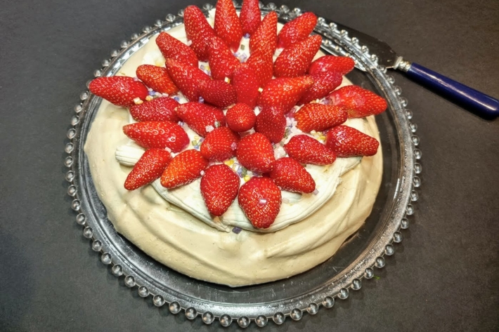 Toujours aussi dingue de meringue et de toutes ses possibilités, voici une énième pavlova dans laquelle j’ai remplacé la chantilly ou, comme je l’ai déjà fait, la crème diplomate, par un fontainebleau. La recette du fontainebleau n’étant pas déposée, elle peut varier : celle-ci, du blog de Carole, Alter Gusto, est à base de yaourt à la grecque (ou de petit suisse) et de crème fraîche.