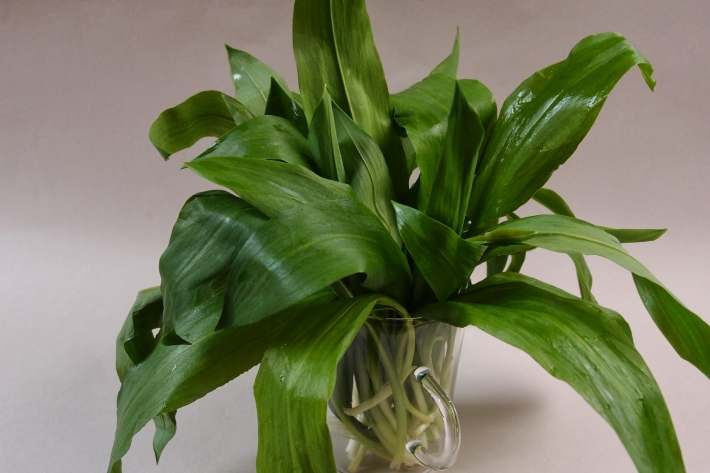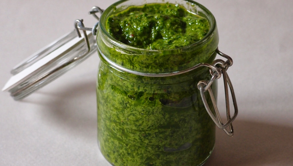 À la saison, usez et abuser de cet ail sauvage. Ou gardez des feuilles au congélateur toute l’année. Vous en trouverez à la fin de l’hiver, début mars, dans les sous-bois, mais ne confondez pas avec les feuilles de muguet (toxiques). Notre précieux jardinier Jacky la Main verte m’en a envoyé un bouquet… Encore plus simple, achetez-en au marché, pour un prix très raisonnable. Ciselez cet ail au-dessus d’une salade, ajoutez-en à un gratin ou faites-en une purée de type pesto ou salsa verde. Je vous livre ma version sans parmesan.