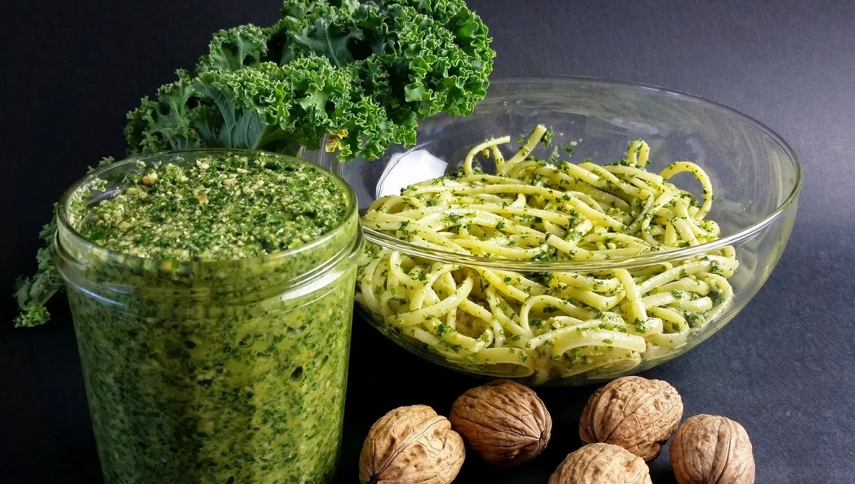 On trouve du chou kale même chez Monoprix, à présent. Après la salade et les chips de kale, voici le pesto grâce à On dîne chez Nanou et aux Papilles estomaquées, interprété à ma sauce. Comme Nanou, j’ai plutôt opté pour les noix, mais avec aussi de l’huile de noix, dont le prix est compensé du fait de l’absence de parmesan…