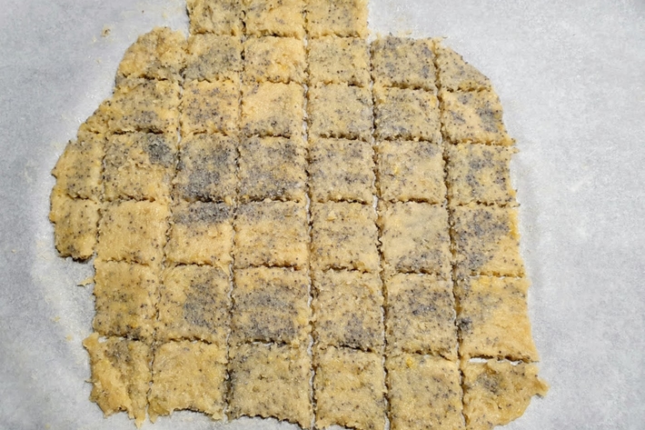 Retirez la feuille du dessus et découpez la pâte en carrés d’environ 2 centimètres de côté avec un simple couteau ou une roulette dentelée.