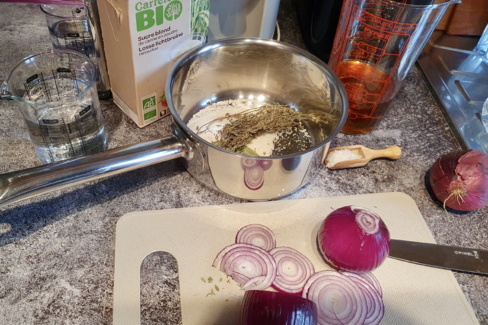 Portez le vinaigre et l’eau avec le sucre, le sel, une feuille de laurier et quelques brins de thym à ébullition dans une casserole.