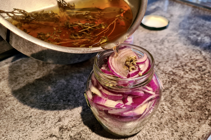 Versez le mélange vinaigré (sans le laurier) bouillant sur les oignons de sorte que toutes les lamelles d’oignon soient immergées.