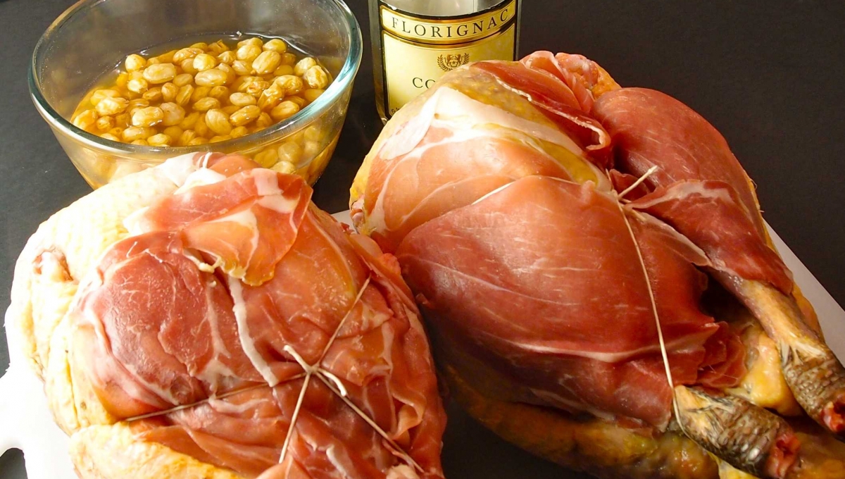 Farcissez l’intérieur de chaque pintade d’un demi-Boursin au poivre. Emballez-les avec les tranches de jambon cru et ficelez-les.