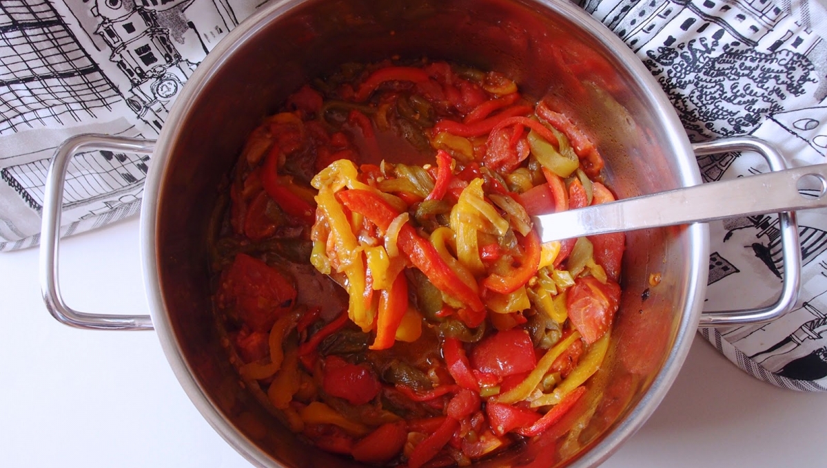 Lavez, séchez et coupez les tomates en dés et ajoutez-les aux poivrons, mélangez et poursuivez la cuisson 40 minutes.