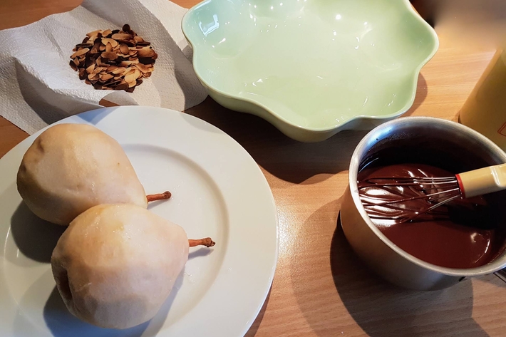 La poire, à mon goût, est le seul fruit frais que j’aime allier au chocolat. D’où l’idée toute simple de farcir le cœur de demi-poires avec une petite ganache au chocolat et de les garnir d’un peu de crème anglaise.