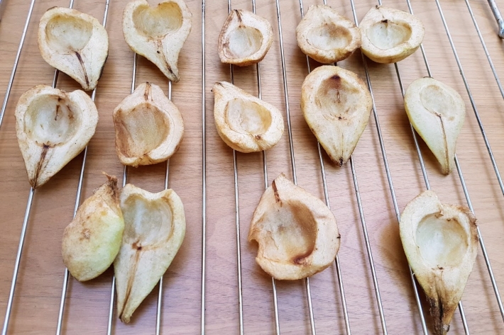 Attention, j’ai commencé par les poser sur une feuille de papier cuisson, mais les poires n’ont pas vraiment séché. J’ai repris la cuisson pendant environ quatre heures en posant les demi-poires directement sur la grille. Un travail de longue haleine…