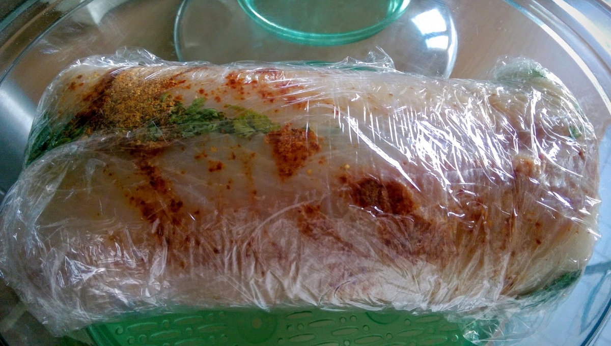 Recouvrez du troisième morceau de poisson et enroulez bien les poisson autour des herbes avec le film.