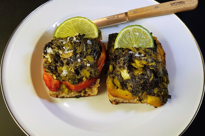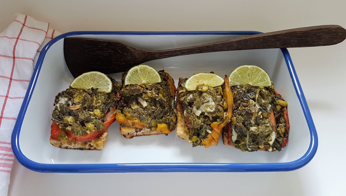 Déposez un demi-poivron sur chaque morceau de pain, arrosez d’un petit filet d’huile d’olive et remettez 20 à 30 minutes dans le four, porte ouverte.