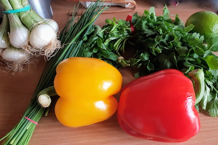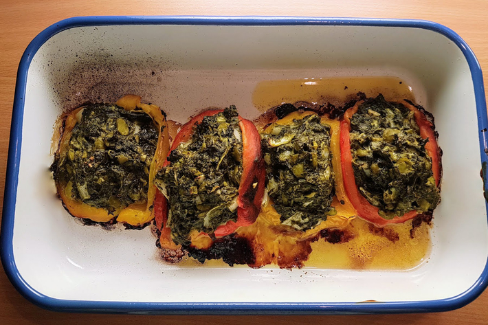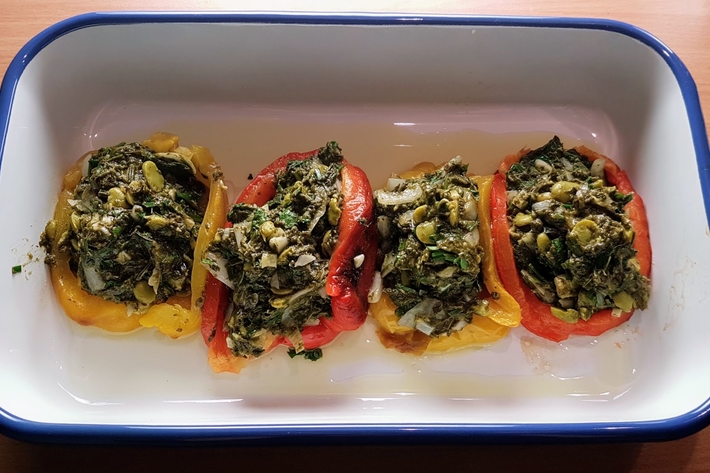 Encore une recette reprise d’Alain Passard, qui nous concocte de véritables tableaux avec les fruits et légumes. Ces poivrons fourrés n’ont peut-être pas l’audace de certaines de ses autres recettes, mais ces herbes printanières enchantent nos sens.