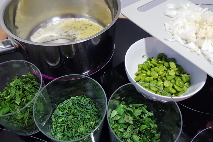Versez dedans les herbes et l’oseille (ou les tablettes d’oseille surgelée), l’ail, les oignons et les fèves.
