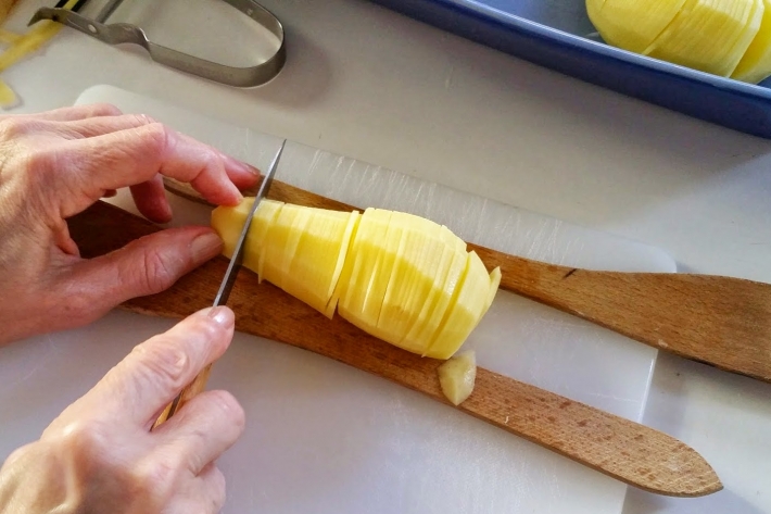 La blogosphère regorge de pommes de terre à la suédoise. Inutile d’innover, mais cette façon de faire les pommes de terre est réellement scandinave. Une astuce pour les couper et, hop, au four !