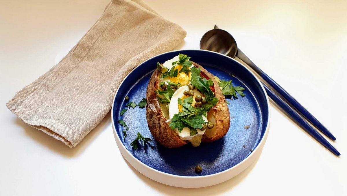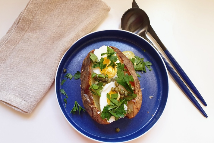 “Ces pommes de terre peuvent se manger en plat principal avec une salade verte. Selon la taille de pommes de terre, servez-en une ou deux par personne.”