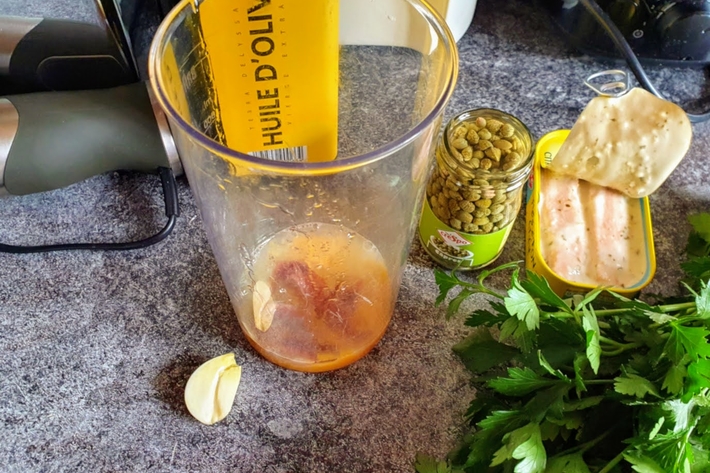 Versez les jaunes d’œufs dans un bol en hauteur, ajoutez-y le jus de citron, les anchois, le thon, l’ail, les deux tiers du persil et la moitié des câpres.
