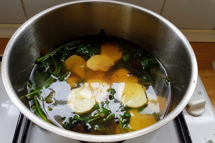 Versez l’eau, ajoutez les morceaux de pommes de terre, la demi-tablette de bouillon, poivrez et laissez frémir à couvert environ 20 minutes.