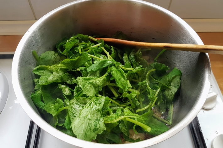 Ajoutez les fanes de radis par dessus l’oignon grillé, remuez jusqu’à ce qu’elles soient fondues (comme l’oseille).