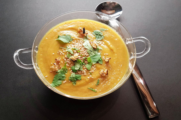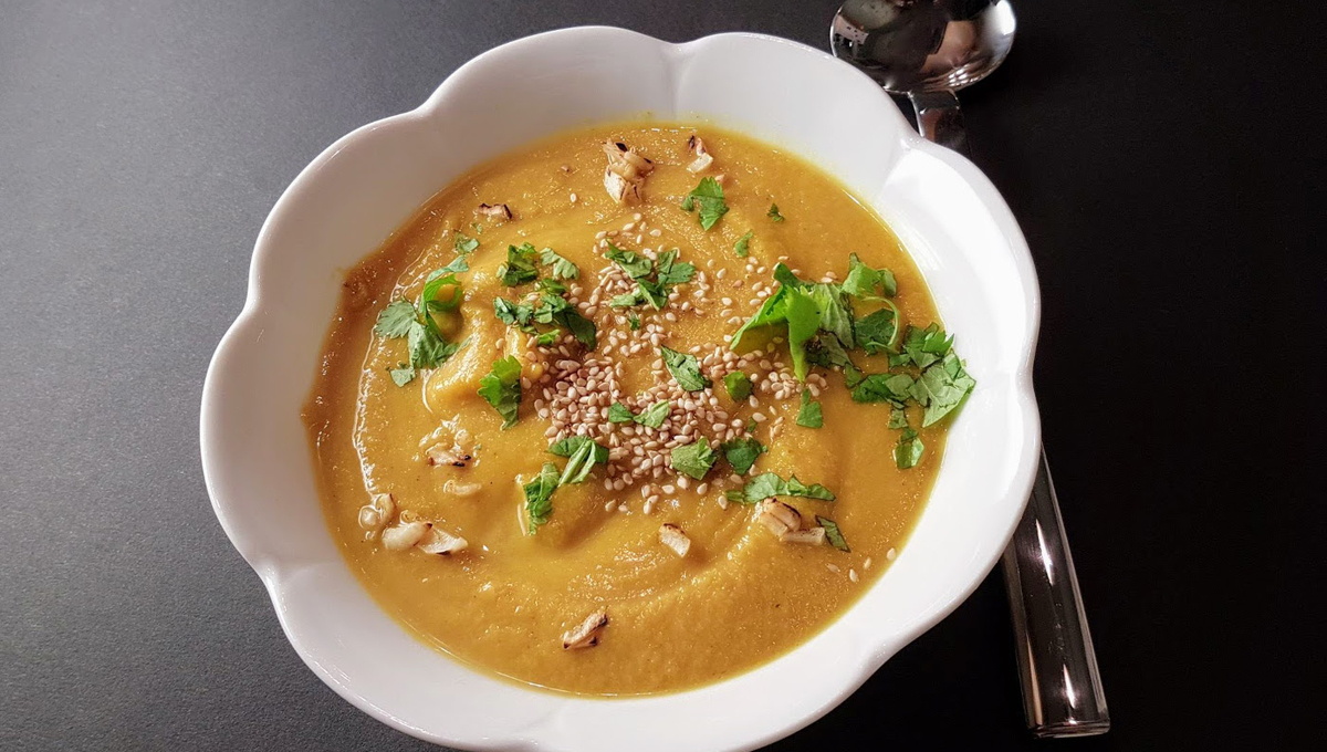 Servez la soupe parsemée de coriandre, de graines de sésame et d’ail grillé.