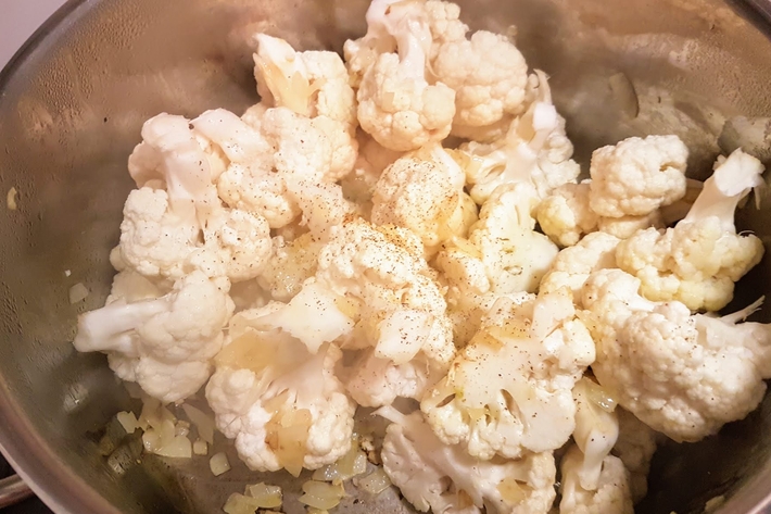 Faites revenir l’oignon dans une casserole avec l’huile avant d’ajouter la moitié de l’ail et le chou-fleur.