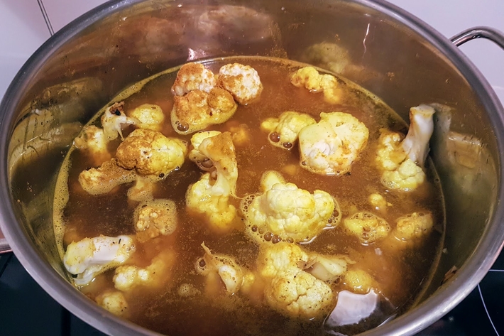 Le curcuma est censé nous protéger de tout. Avec de l’ail, il change étrangement tout ce qu‘il accompagne. Avec le chou-fleur, qu’il transforme beaucoup, veillez à ne pas dépasser la quantité prescrite, mais vous aurez un potage santé impeccable.