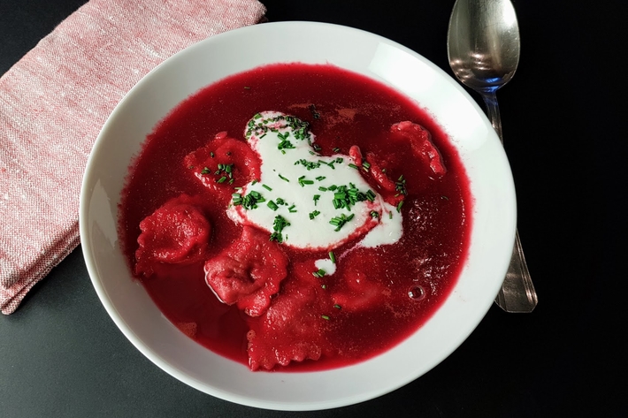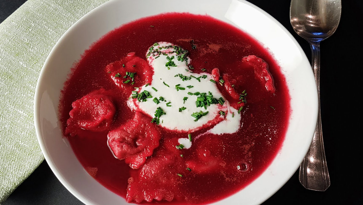 Toujours un potage qui fleure bon l’Europe de l’Est. Avec ses betteraves et ses raviolis, il se rapproche du bortsch. Mais, ici, les betteraves sont broyées dans le potage. Le lait Ribot ajouté à de la crème remplace la crème aigre, et le piment, dosé juste ce qu’il faut, font de ce potage, à la fois doux et relevé, un délice.