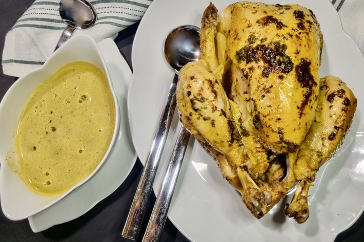 Adaptez le temps de cuisson au poids du poulet : 30 minutes par livre, soit plutôt 2 heures pour 2 kilos. Avec mon habituel sac de cuisson, c’est plus rapide et 1h30 suffit.