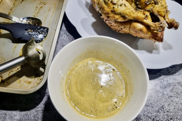 Gardez la viande au chaud, récupérez le jus de cuisson avec les sucs de la viande et mixez-les de façon à bien émulsionner le tout.