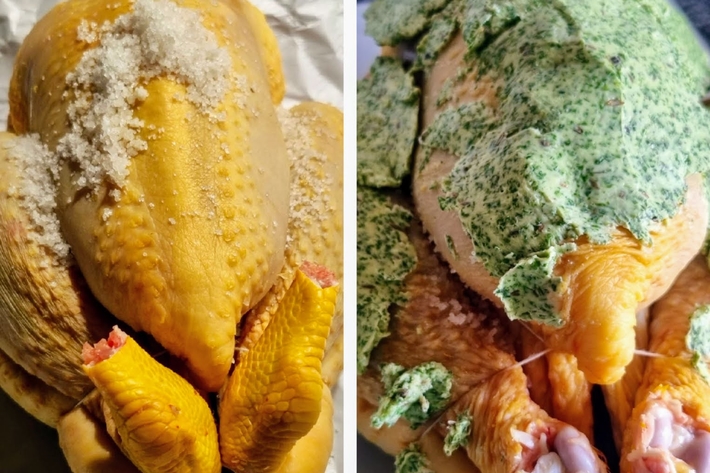 Tartinez le poulet avec le beurre d’épices, poivrez et enfournez 1h30 à 180° (thermostat 6) ou 200° (thermostat 7) à chaleur statique.