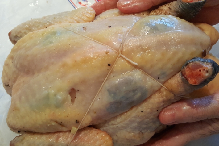 Introduisez le gésier et le foie dans le poulet, salez-le avec du sel à la truffe et reficelez-le bien serré.