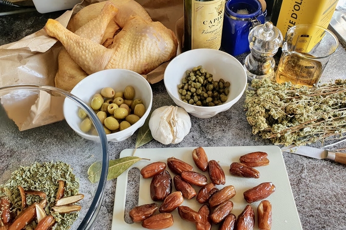 Mélangez, dans un grand saladier, l’ail et les dattes, les câpres (avec 2 cuillerées à soupe de leur jus de conservation), les olives vertes, le sel, quelques tours de moulin à poivre, le vinaigre, l’huile, la moitié du vin blanc, le laurier et l’origan (mais gardez-en pour la présentation finale).