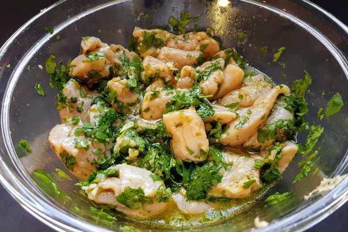 Ajoutez les deux tiers de la coriandre et l’ail à la marinade.
