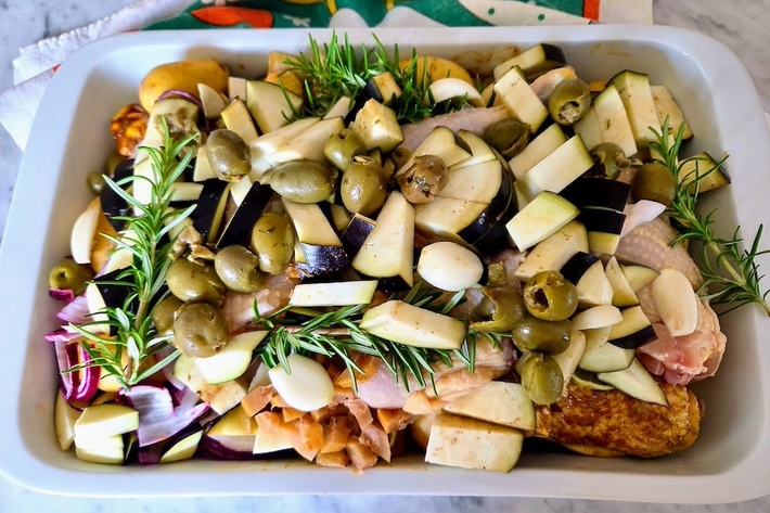Ajoutez la fin des pommes de terre et des aubergines, les olives, l’oignon, l’ail, le citron confit, le citron et le romarin.
