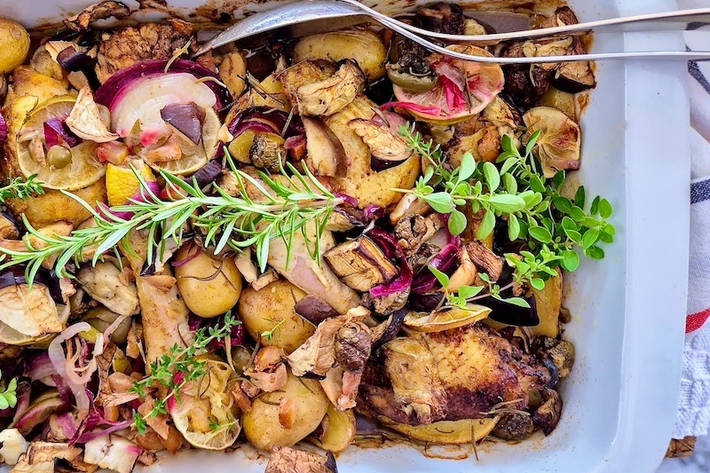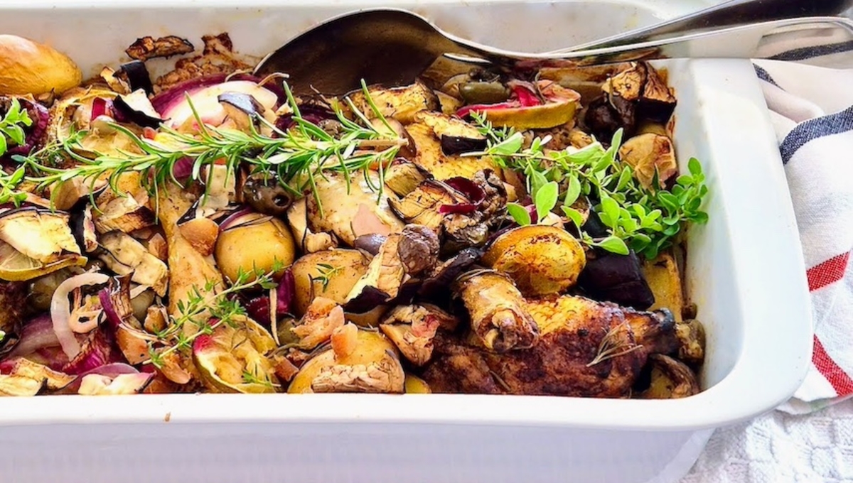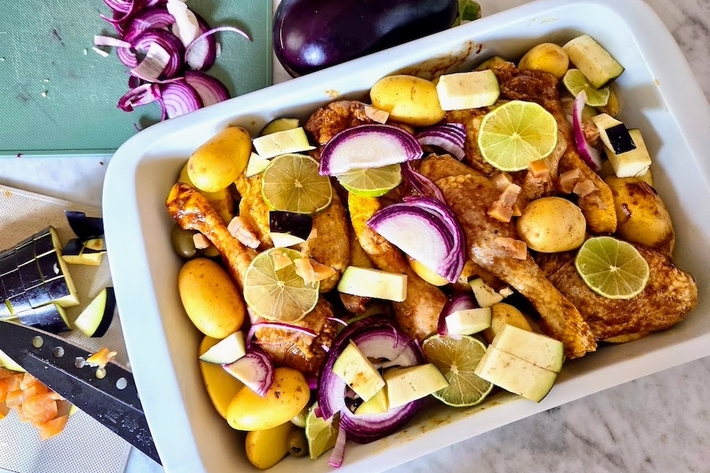 Voici une recette facile pour les vacances, avec la viande et les légumes ensemble, et que tout le monde va adorer. Je la dois à Anne, de On dîne chez Nanou. En plus, vous l’adaptez un peu comme bon vous semble, selon vos goûts et vos réserves. Vous faites mariner vos cuisses de poulet une nuit et enfournez une heure avant de passer à table. Étonnant, non ?