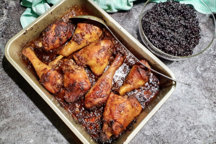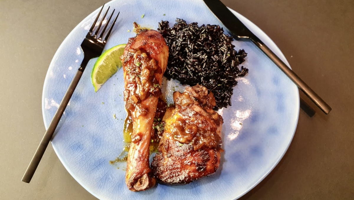 Accompagnez de frites pour les puristes, mais j’ai fait le choix d’un riz noir pilaf au four (cuit en même temps que le poulet, par exemple, si votre four est assez grand, ou préalablement) ou à la casserole.