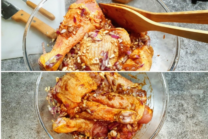 Ajoutez l’oignon, l’ail, le miel, le ketchup et la sauce soja. Mélangez le tout et couvrez d’un film.
