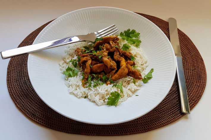 Servez le poulet entouré du riz et saupoudrez de coriandre.